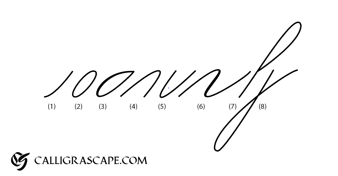 In the image above there are 7 basic strokes: (1) the entrance stroke, (2) oval, (3) teardrop, (4) overturn, (5) underturn, (6) compound, (7) ascender and (8) descender. All strokes but 3 and 6 are completed with minimal to no pressure.