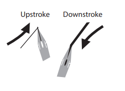 Downstrokes are typically made every time you need to make the thick lines that create the identifiable part of each letter. Downstrokes are done by applying medium nib pressure onto the page while pulling the pen downwards (towards yourself). This will create a thicker strokes that contrast well with your upstrokes.