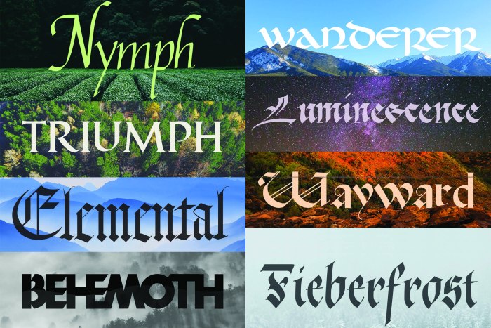FontsBlackletter Font BundleAll 8 scripts, 1 low price.Blackletter Megapack (8 scripts)Individual FontsWanderer is based on the Uncial blackletter calligraphy alphabet. Get those “Lord of the Rings” vibes.BEHEMOTH is a Neuland-based script for bold and condensed writing.Wayward is a blackletter calligraphy font based on Rotunda for robust and classy writing.Nymph is a Italic broad-edge calligraphy script for pleasant and calm writing.Elemental is a Textura-based broad edge script for strong and elegant writing.Luminescence is a Bâtarde-based font for creative and unique writing.TRIUMPH is Roman capitals-based script for powerful and sleek writing.Fieberfrost is a Fraktur-based script for boldness and creative writing.