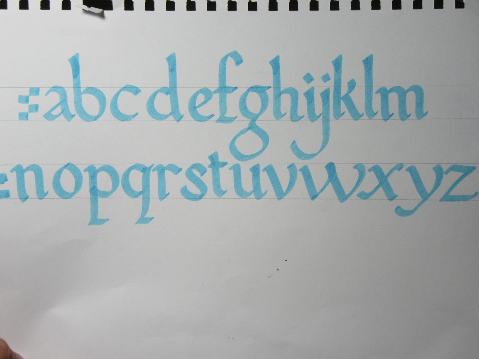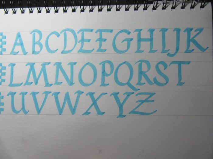 The “abcde” is from the “foundational” alphabet from the blackletter family of scripts. It is a great alphabet to start learning calligraphy due to its variety of curves and serifs.