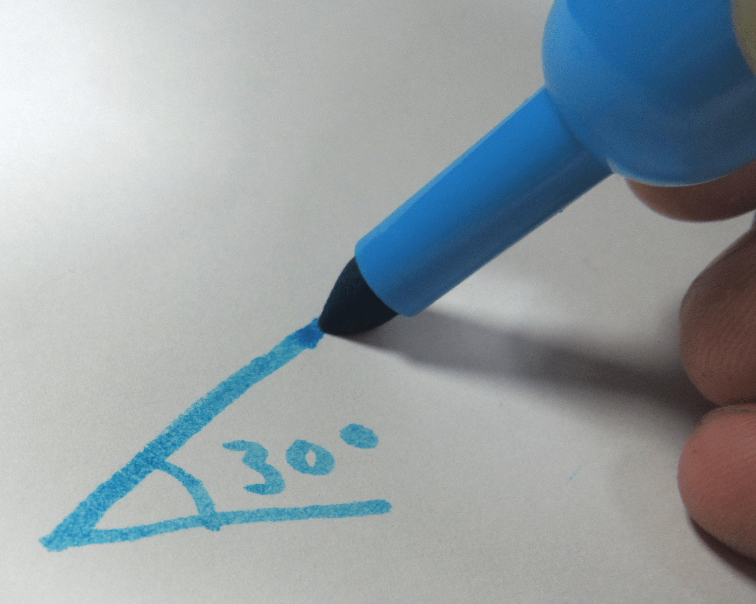 The first thing you need to do is hold your highlighter like you would any other writing utensil. Next, rotate it until the chisel tip is at a 30 degree angle from the horizontal line you wish to write along. Keep this angle at ALL times.