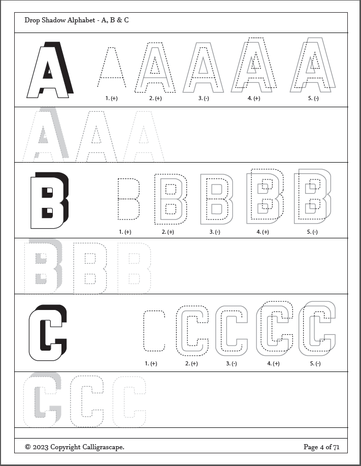 For those who want to try their hand at calligraphy with a tool they already have (such as a pen or a pencil) these are the practice sheets for you. They provide an easy way to start learning 4 Handlettering styles: Drop Shadow, 3D Block, 3D Trench and Bevel. From there, the sheets will then teach you how to apply these styles to different kinds of letters, so that you can make any letters 3-dimensional!