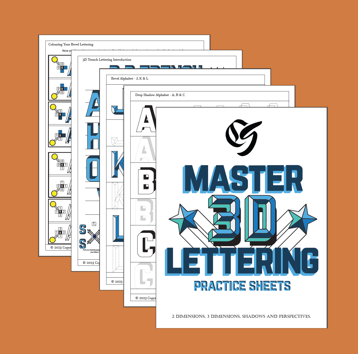 This 71 page PDF workbook is a beginner friendly “one-stop-shop” for learning 3D Handlettering. All of the relevant information in one place and everything you need to practice to learn the 4 styles in this book.