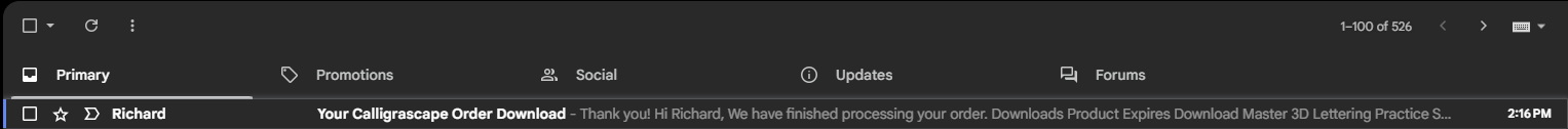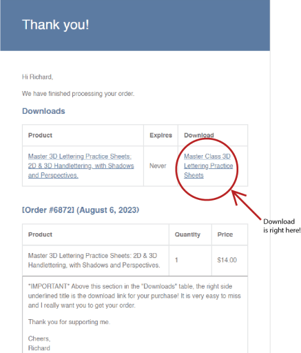 During the purchase, you will enter all of your information and the most important piece is the email the download link will be sent to. It’s easy to make a spelling mistake, and if you did, please contact richard@calligrascape.com to remedy the situation.