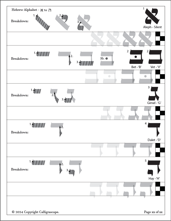This 21 page Hebrew PDF workbook is a beginner friendly “one-stop-shop” for learning Hebrew broad edge calligraphy (כְּתָב אַשּׁוּרִי/ Ktav Ashuri / Scribe Style). These calligraphy practice sheets teach how to form each letter and diacritics, however, it does not teach the Hebrew language.