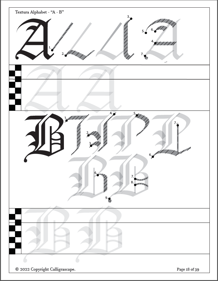 - Blackletter Diagram Legend – How to use the stroke-by-stroke teaching diagrams throughout the sheets