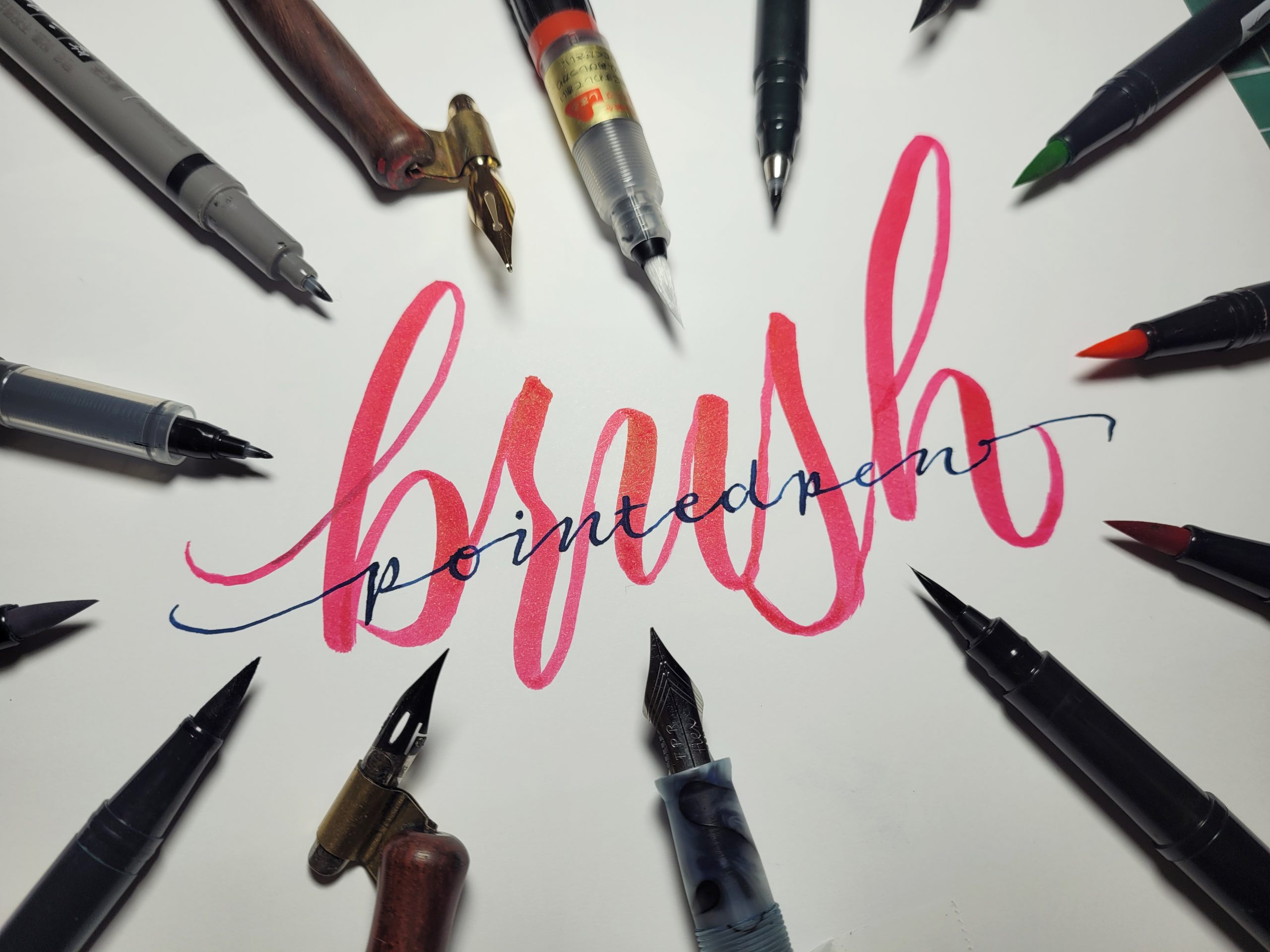 Both brush pens and pointed pens share the same family of scripts. They both write flowing scripts characterized by thick downstrokes and thin upstrokes. There are many scripts to learn and try and you can view them all here: Breaking Down: Pointed Pen