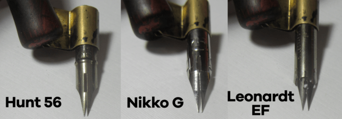 When I first started learning pointed pen calligraphy I saw a number of nibs and didn’t see too many differences between them. Once I started purchasing and using them for myself, the biggest difference I started to notice was the flexibility. In the image above you can see the flexibility of each nib get higher as you go right. This means that the sensitivity is higher and therefore the difficulty, which means you just need more practice and generally a lighter touch. The Leonardt EF is not a bad nib, it is just if you are not careful you can drop all your ink into one blob (quite frustrating). They require a lot more practice but give you a much higher line variation for different styles of calligraphy.